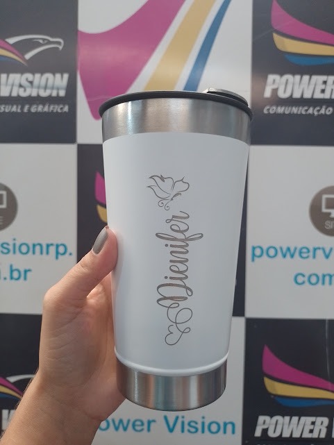 O Copo Térmico Power Vision é feito em aço inox de alta qualidade, com gravação a laser permanente — não desbota, não risca e garante um visual profissional.