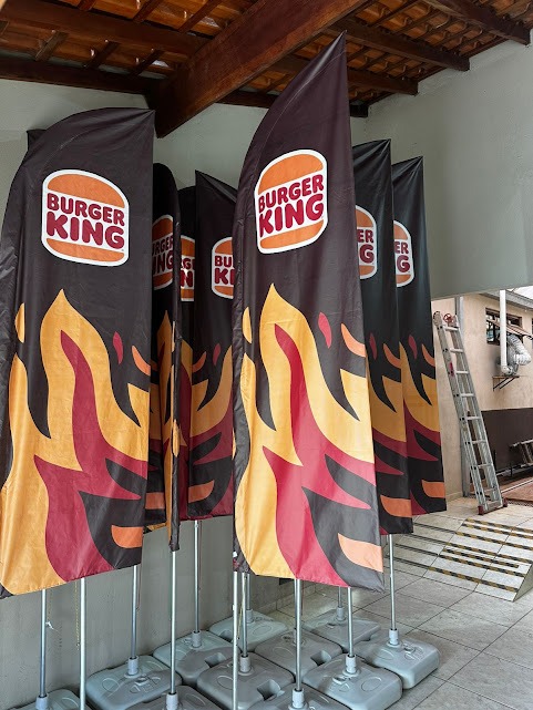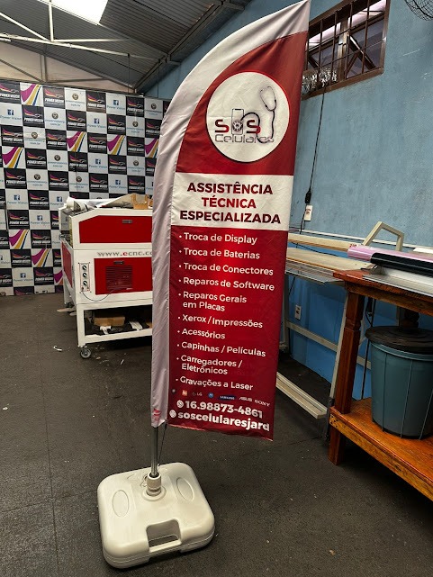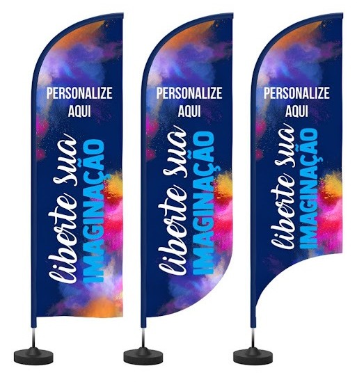 Bandeira personalizada tipo (Wind banner), com estrutura completa (haste, base e tecido impresso).