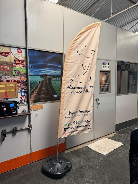 Produzida com impressão digital colorida em alta resolução e acabamento reforçado, possui haste de alumínio e base com reservatório para água ou areia, garantindo estabilidade e durabilidade.